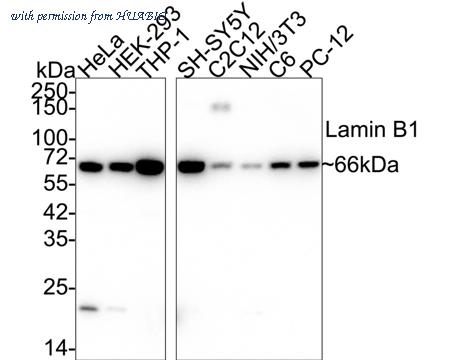 Western blot analysis of Lamin B1 on different lysates with Rabbit anti-Lamin B1 antibody (ET1606-27) at 1/50,000 dilution. Lane 1: HeLa cell lysate Lane 2: HEK-293 cell lysate Lane 3: THP-1 cell lysate Lane 4: SH-SY5Y cell lysate Lane 5: C2C12 cell lysate Lane 6: NIH/3T3 cell lysate Lane 7: C6 cell lysate Lane 8: PC-12 cell lysate Lysates/proteins at 15 µg/Lane. Predicted band size: 66 kDa Observed band size: 66 kDa Exposure time: 21 seconds; ECL: K1801; 4-20% SDS-PAGE gel. Proteins were transferred to a PVDF membrane and blocked with 5% NFDM/TBST for 1 hour at room temperature. The primary antibody (ET1606-27) at 1/50,000 dilution was used in 5% NFDM/TBST at 4℃ overnight. Goat Anti-Rabbit IgG - HRP Secondary Antibody (HA1001) at 1/50,000 dilution was used for 1 hour at room temperature.