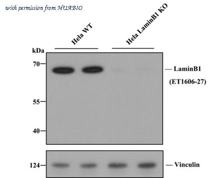 All lanes: Western blot analysis of Lamin B1 with anti-Lamin B1 antibody [SI17-06] (HA750098) at 1:1,000 dilution. Lane 1/2: Wild-type Hela whole cell lysate (20 µg). Lane 3/4: Lamin B1 knockout Hela whole cell lysate (20 µg). ET1606-27 was shown to specifically react with Lamin B1 in wild-type Hela cells. No band was observed when Lamin B1 knockout samples were tested. Wild-type and Lamin B1 knockout samples were subjected to SDS-PAGE. Proteins were transferred to a PVDF membrane and blocked with 5% NFDM in TBST for 1 hour at room temperature. The primary antibody (ET1606-27, 1/1,000) and Loading control antibody(Rabbit anti-Vinculin, ET1705-94, 1/5,000) was used in 5% BSA at room temperature for 2 hours. Goat Anti-Rabbit IgG-HRP Secondary Antibody (HA1001) at 1:200,000 dilution was used for 1 hour at room temperature.