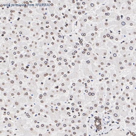 Immunohistochemical analysis of paraffin-embedded human liver tissue with Rabbit anti-Lamin B1 antibody (HA750098) at 1/1,000 dilution. The section was pre-treated using heat mediated antigen retrieval with Tris-EDTA buffer (pH 9.0) for 20 minutes. The tissues were blocked in 1% BSA for 20 minutes at room temperature, washed with ddH2O and PBS, and then probed with the primary antibody (HA750098) at 1/1,000 dilution for 1 hour at room temperature. The detection was performed using an HRP conjugated compact polymer system. DAB was used as the chromogen. Tissues were counterstained with hematoxylin and mounted with DPX.