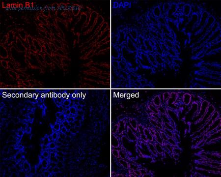 Immunofluorescence analysis of paraffin-embedded rat large intestine tissue labeling Lamin B1 (HA720172F). The section was pre-treated using heat mediated antigen retrieval with sodium citrate buffer (pH 6.0) (high pressure) for 2 minutes. The tissues were blocked in 10% negative goat serum for 1 hour at room temperature, washed with PBS. And then probed with the primary antibody Lamin B1 (HA720172F, iFluor™ 647) at 1/200 dilution overnight at 4 ℃, washed with PBS. DAPI was used as nuclear counterstain.