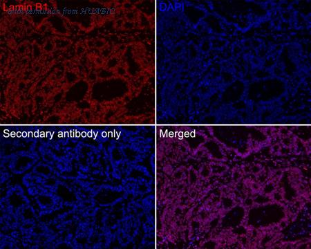 Immunofluorescence analysis of paraffin-embedded human colon carcinoma tissue labeling Lamin B1 (HA720172F). The section was pre-treated using heat mediated antigen retrieval with sodium citrate buffer (pH 6.0) (high pressure) for 2 minutes. The tissues were blocked in 10% negative goat serum for 1 hour at room temperature, washed with PBS. And then probed with the primary antibody Lamin B1 (HA720172F, iFluor™ 647) at 1/200 dilution overnight at 4 ℃, washed with PBS. DAPI was used as nuclear counterstain.