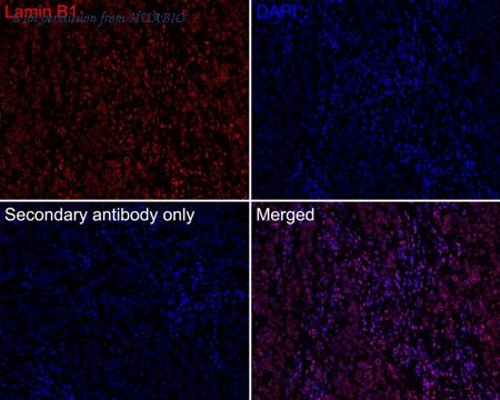Immunofluorescence analysis of paraffin-embedded human breast carcinoma tissue labeling Lamin B1 (HA720172F). The section was pre-treated using heat mediated antigen retrieval with sodium citrate buffer (pH 6.0) (high pressure) for 2 minutes. The tissues were blocked in 10% negative goat serum for 1 hour at room temperature, washed with PBS. And then probed with the primary antibody Lamin B1 (HA720172F, iFluor™ 647) at 1/200 dilution overnight at 4 ℃, washed with PBS. DAPI was used as nuclear counterstain.