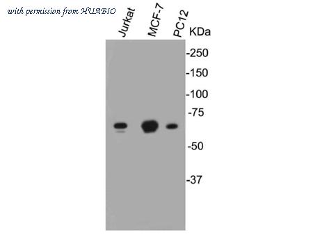 Western blot analysis on different cell lysates using anti- Lamin B1 rabbit polyclonal antibodies.