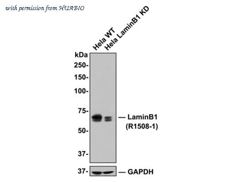 All lanes: Western blot analysis of Lamin B1 with anti-Lamin B1 antibody (R1508-1) at 1/500 dilution. Lane 1: Wild-type Hela whole cell lysate (10 µg). Lane 2: Lamin B1 knockdown Hela whole cell lysate (10 µg). R1508-1 was shown to specifically react with Lamin B1 in wild-type Hela cells. Weakened band was observed when Lamin B1 knockdown sample was tested. Wild-type and Lamin B1 knockdown samples were subjected to SDS-PAGE. Proteins were transferred to a PVDF membrane and blocked with 5% NFDM in TBST for 1 hour at room temperature. The primary antibody (R1508-1, 1/500) was used in 5% BSA at room temperature for 2 hours. Goat Anti-Rabbit IgG-HRP Secondary Antibody (HA1001) at 1:300,000 dilution was used for 1 hour at room temperature.