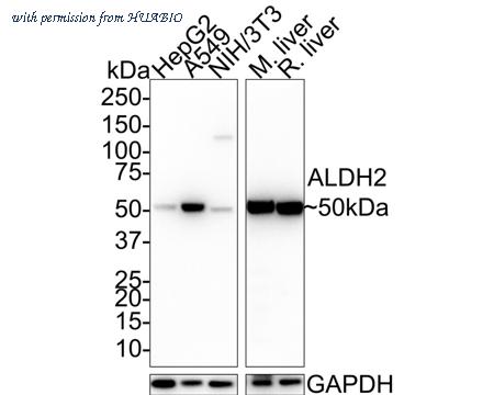 Western blot analysis of ALDH2 on different lysates with Mouse anti-ALDH2 antibody (HA610059) at 1/1,000 dilution. Lane 1: HepG2 cell lysate (20 µg/Lane) Lane 2: A549 cell lysate (20 µg/Lane) Lane 3: NIH/3T3 cell lysate (20 µg/Lane) Lane 4: Mouse liver tissue lysate (40 µg/Lane) Lane 5: Rat liver tissue lysate (40 µg/Lane) Predicted band size: 56 kDa Observed band size: 50 kDa Exposure time: 40 seconds; 4-20% SDS-PAGE gel. Proteins were transferred to a PVDF membrane and blocked with 5% NFDM/TBST for 1 hour at room temperature. The primary antibody (HA610059) at 1/1,000 dilution was used in 5% NFDM/TBST at room temperature for 2 hours. Goat Anti-Mouse IgG - HRP Secondary Antibody (HA1006) at 1/100,000 dilution was used for 1 hour at room temperature.