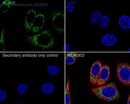 Immunocytochemistry analysis of HepG2 cells labeling ALDH2 with Mouse anti-ALDH2 antibody (M1501-7) at 1/100 dilution. Cells were fixed in 4% paraformaldehyde for 20 minutes at room temperature, permeabilized with 0.1% Triton X-100 in PBS for 5 minutes at room temperature, then blocked with 1% BSA in 10% negative goat serum for 1 hour at room temperature. Cells were then incubated with Mouse anti-ALDH2 antibody (M1501-7) at 1/100 dilution in 1% BSA in PBST overnight at 4 ℃. Goat Anti-Mouse IgG H&L (iFluor™ 488, HA1125) was used as the secondary antibody at 1/1,000 dilution. PBS instead of the primary antibody was used as the secondary antibody only control. Nuclear DNA was labelled in blue with DAPI. beta Tubulin (ET1602-4, red) was stained at 1/100 dilution overnight at +4℃. Goat Anti-Rabbit IgG H&L (iFluor™ 594, HA1122) were used as the secondary antibody at 1/1,000 dilution.