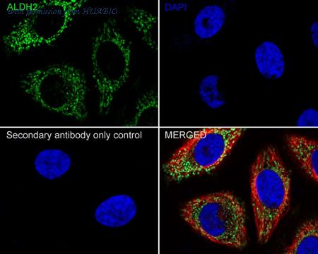 Immunocytochemistry analysis of HeLa cells labeling ALDH2 with Mouse anti-ALDH2 antibody (M1509-1) at 1/100 dilution. Cells were fixed in 4% paraformaldehyde for 15 minutes at room temperature, permeabilized with 0.1% Triton X-100 in PBS for 15 minutes at room temperature, then blocked with 1% BSA in 10% negative goat serum for 1 hour at room temperature. Cells were then incubated with Mouse anti-ALDH2 antibody (M1509-1) at 1/100 dilution in 1% BSA in PBST overnight at 4 ℃. Goat Anti-Mouse IgG H&L (iFluor™ 488, HA1125) was used as the secondary antibody at 1/1,000 dilution. PBS instead of the primary antibody was used as the secondary antibody only control. Nuclear DNA was labelled in blue with DAPI. beta Tubulin (ET1602-4, red) was stained at 1/100 dilution overnight at +4℃. Goat Anti-Rabbit IgG H&L (iFluor™ 594, HA1122) was used as the secondary antibody at 1/1,000 dilution.