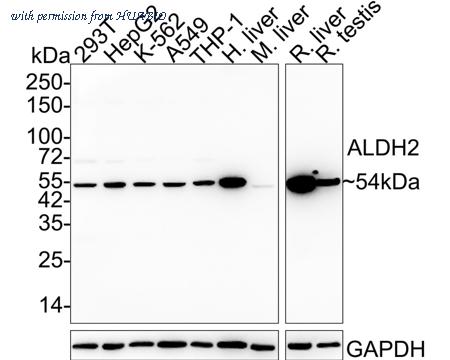Western blot analysis of ALDH2 on different lysates with Mouse anti-ALDH2 antibody (M1501-7) at 1/1,000 dilution. Lane 1: 293T cell lysate (20 µg/Lane) Lane 2: HepG2 cell lysate (20 µg/Lane) Lane 3: K-562 cell lysate (20 µg/Lane) Lane 4: A549 cell lysate (20 µg/Lane) Lane 5: THP-1 cell lysate (20 µg/Lane) Lane 6: Human liver tissue lysate (40 µg/Lane) Lane 7: Mouse liver tissue lysate (40 µg/Lane) Lane 8: Rat liver tissue lysate (40 µg/Lane) Lane 9: Rat testis tissue lysate (40 µg/Lane) Predicted band size: 56 kDa Observed band size: 54 kDa Exposure time: 1 minute 30 seconds; 4-20% SDS-PAGE gel. Proteins were transferred to a PVDF membrane and blocked with 5% NFDM/TBST for 1 hour at room temperature. The primary antibody (M1501-7) at 1/1,000 dilution was used in 5% NFDM/TBST at 4℃ overnight. Goat Anti-Mouse IgG - HRP Secondary Antibody (HA1006) at 1/50,000 dilution was used for 1 hour at room temperature.