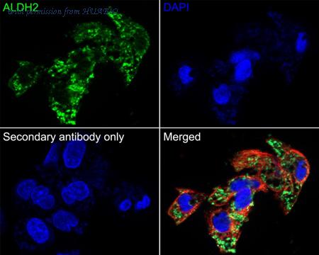 ICC staining ALDH2 in HepG2 cells (green). Cells were fixed in paraformaldehyde, permeabilised with 0.25% Triton X100/PBS and counterstained with DAPI in order to highlight the nucleus (blue).