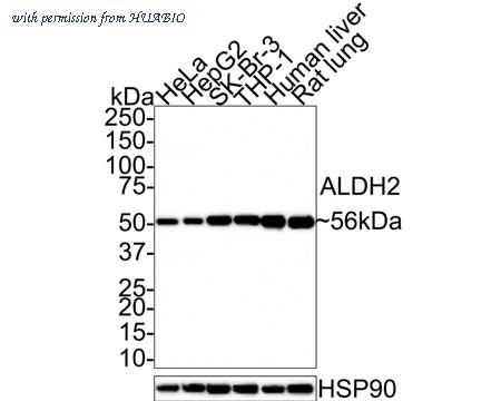 Western blot analysis of ALDH2 on different lysates with Rabbit anti-ALDH2 antibody (R1407-3) at 1/1,000 dilution. Lane 1: HeLa cell lysate (15 µg/Lane) Lane 2: HepG2 cell lysate (15 µg/Lane) Lane 3: SK-Br-3 cell lysate (15 µg/Lane) Lane 4: THP-1 cell lysate (15 µg/Lane) Lane 5: Human liver tissue lysate (30 µg/Lane) Lane 6: Rat lung tissue lysate (30 µg/Lane) Predicted band size: 56 kDa Observed band size: 56 kDa Exposure time: 20 seconds; 4-20% SDS-PAGE gel. Proteins were transferred to a PVDF membrane and blocked with 5% NFDM/TBST for 1 hour at room temperature. The primary antibody (R1407-3) at 1/1,000 dilution was used in 5% NFDM/TBST at room temperature for 2 hours. Goat Anti-Rabbit IgG - HRP Secondary Antibody (HA1001) at 1:100,000 dilution was used for 1 hour at room temperature.