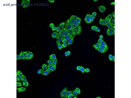 Immunocytochemistry analysis of SK-Br-3 cells labeling ALDH2 with Mouse anti-ALDH2 antibody (HA601175) at 1/250 dilution. Cells were fixed in 4% paraformaldehyde for 20 minutes at room temperature, permeabilized with 0.1% Triton X-100 in PBS for 5 minutes at room temperature, then blocked with 1% BSA in 10% negative goat serum for 1 hour at room temperature. Cells were then incubated with Mouse anti-ALDH2 antibody (HA601175) at 1/250 dilution in 1% BSA in PBST overnight at 4 ℃. Goat Anti-Mouse IgG H&L (iFluor™ 488, HA1125) was used as the secondary antibody at 1/1,000 dilution. PBS instead of the primary antibody was used as the secondary antibody only control. Nuclear DNA was labelled in blue with DAPI. beta Tubulin (ET1602-4, red) was stained at 1/100 dilution overnight at +4℃. Goat Anti-Rabbit IgG H&L (iFluor™ 594, HA1122) were used as the secondary antibody at 1/1,000 dilution.