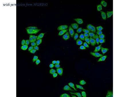 ICC staining ALDH2 in Hela cells (green). Cells were fixed in paraformaldehyde, permeabilised with 0.25% Triton X100/PBS and counterstained with DAPI in order to highlight the nucleus (blue).