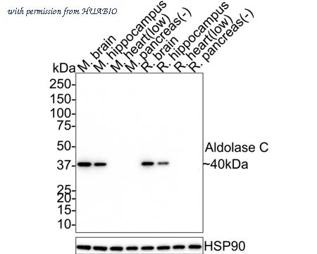 Western blot analysis of Aldolase C on different lysates with Rabbit anti-Aldolase C antibody (HA721734) at 1/1,000 dilution. Lane 1: Mouse brain tissue lysate Lane 2: Mouse hippocampus tissue lysate Lane 3: Mouse heart tissue lysate (low expression) Lane 4: Mouse pancreas tissue lysate (negative) Lane 5: Rat brain tissue lysate Lane 6: Rat hippocampus tissue lysate Lane 7: Rat heart tissue lysate (low expression) Lane 8: Rat pancreas tissue lysate (negative) Lysates/proteins at 20 µg/Lane. Predicted band size: 40 kDa Observed band size: 40 kDa Exposure time: 3 minutes; ECL: K1801; 4-20% SDS-PAGE gel. Proteins were transferred to a PVDF membrane and blocked with 5% NFDM/TBST for 1 hour at room temperature. The primary antibody (HA721734) at 1/1,000 dilution was used in 5% NFDM/TBST at 4℃ overnight. Goat Anti-Rabbit IgG - HRP Secondary Antibody (HA1001) at 1/50,000 dilution was used for 1 hour at room temperature.