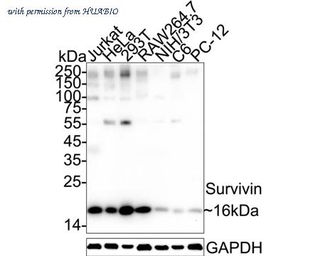 Western blot analysis of Survivin on different lysates with Rabbit anti-Survivin antibody (HA750076) at 1/1,000 dilution. Lane 1: Jurkat cell lysate Lane 2: HeLa cell lysate Lane 3: 293T cell lysate Lane 4: RAW264.7 cell lysate Lane 5: NIH/3T3 cell lysate Lane 6: C6 cell lysate Lane 7: PC-12 cell lysate Lysates/proteins at 20 µg/Lane. Predicted band size: 16 kDa Observed band size: 16 kDa Exposure time: 2 minutes; ECL: K1801; 4-20% SDS-PAGE gel. Proteins were transferred to a PVDF membrane and blocked with 5% NFDM/TBST for 1 hour at room temperature. The primary antibody (HA750076) at 1/1,000 dilution was used in 5% NFDM/TBST at 4℃ overnight. Goat Anti-Rabbit IgG - HRP Secondary Antibody (HA1001) at 1/50,000 dilution was used for 1 hour at room temperature.