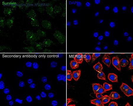 Immunocytochemistry analysis of RAW264.7 cells labeling Survivin with Rabbit anti-Survivin antibody (ET1604-34) at 1/100 dilution. Cells were fixed in 4% paraformaldehyde for 15 minutes at room temperature, permeabilized with 0.1% Triton X-100 in PBS for 15 minutes at room temperature, then blocked with 1% BSA in 10% negative goat serum for 1 hour at room temperature. Cells were then incubated with Rabbit anti-Survivin antibody (ET1604-34) at 1/100 dilution in 1% BSA in PBST overnight at 4 ℃. Goat Anti-Rabbit IgG H&L (iFluor™ 488, HA1121) was used as the secondary antibody at 1/1,000 dilution. PBS instead of the primary antibody was used as the secondary antibody only control. Nuclear DNA was labelled in blue with DAPI. Beta tubulin (HA601187, red) was stained at 1/100 dilution overnight at +4℃. Goat Anti-Mouse IgG H&L (iFluor™ 594, HA1126) was used as the secondary antibody at 1/1,000 dilution.