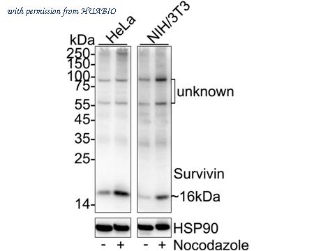 Western blot analysis of Survivin on different lysates with Rabbit anti-Survivin antibody (HA750076) at 1/1,000 dilution. Lane 1: HeLa cell lysate Lane 2: HeLa treated with 100ng/mL Nocodazole for 18 hours cell lysate Lane 3: NIH/3T3 cell lysate Lane 4: NIH/3T3 treated with 100ng/mL Nocodazole for 18 hours cell lysate Lysates/proteins at 20 µg/Lane. Predicted band size: 16 kDa Observed band size: 16 kDa Exposure time: Lane 1-2: 30 seconds; Lane 3-4: 1 minute 2 seconds; ECL: K1801; 4-20% SDS-PAGE gel. Proteins were transferred to a PVDF membrane and blocked with 5% NFDM/TBST for 1 hour at room temperature. The primary antibody (HA750076) at 1/1,000 dilution was used in primary antibody dilution (K1803) at 4℃ overnight. Goat Anti-Rabbit IgG - HRP Secondary Antibody (HA1001) at 1/50,000 dilution was used for 1 hour at room temperature.