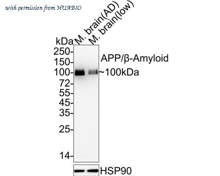 Western blot analysis of APP/beta Amyloid on different lysates with Rabbit anti-APP/beta Amyloid antibody (HA722207) at 1/1,000 dilution. Lane 1: AD Mouse brain tissue lysate Lane 2: Mouse brain tissue lysate (low expression) Lysates/proteins at 20 µg/Lane. Predicted band size: 87 kDa Observed band size: 100 kDa Exposure time: 3 minutes; ECL: K1801; 4-20% SDS-PAGE gel. Proteins were transferred to a PVDF membrane and blocked with 5% NFDM/TBST for 1 hour at room temperature. The primary antibody (HA722207) at 1/1,000 dilution was used in 5% NFDM/TBST at 4℃ overnight. Goat Anti-Rabbit IgG - HRP Secondary Antibody (HA1001) at 1/50,000 dilution was used for 1 hour at room temperature.