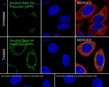 Immunocytochemistry analysis of HeLa cells treated with 100ng/mL Nocodazole for 17 hours labeling APP/beta Amyloid with Rabbit anti-APP/beta Amyloid antibody (HA750977) at 1/100 dilution. Cells were fixed in 4% paraformaldehyde for 20 minutes at room temperature, permeabilized with 0.1% Triton X-100 in PBS for 5 minutes at room temperature, then blocked with 1% BSA in 10% negative goat serum for 1 hour at room temperature. Cells were then incubated with Rabbit anti-APP/beta Amyloid antibody (HA750977) at 1/100 dilution in 1% BSA in PBST overnight at 4 ℃. Goat Anti-Rabbit IgG H&L (iFluor™ 488, HA1121) was used as the secondary antibody at 1/1,000 dilution. PBS instead of the primary antibody was used as the secondary antibody only control. Nuclear DNA was labelled in blue with DAPI.
