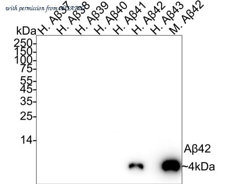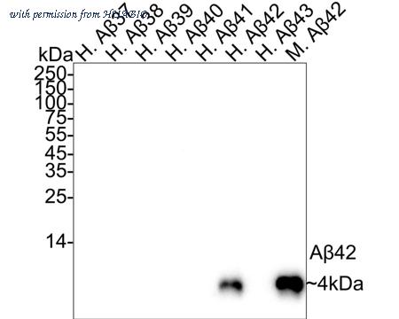 Western blot analysis of beta Amyloid 1-42 on different peptides with Rabbit anti-beta Amyloid 1-42 antibody (HA751103) at 1/1,000 dilution. Lane 1: Human Aβ37 full length peptide (negative) Lane 2: Human Aβ38 full length peptide (negative) Lane 3: Human Aβ39 full length peptide (negative) Lane 4: Human Aβ40 full length peptide (negative) Lane 5: Human Aβ41 full length peptide (negative) Lane 6: Human Aβ42 full length peptide (positive) Lane 7: Human Aβ43 full length peptide (negative) Lane 8: Mouse Aβ42 full length peptide (positive) Lysates/proteins at 100 ng/Lane. Predicted band size: 4 kDa Observed band size: 4 kDa Exposure time: 3 minutes; ECL: K1801; 4-20% SDS-PAGE gel. Proteins were transferred to a PVDF membrane and blocked with 5% NFDM/TBST for 1 hour at room temperature. The primary antibody (HA751103) at 1/1,000 dilution was used in 5% NFDM/TBST at 4℃ overnight. Goat Anti-Rabbit IgG - HRP Secondary Antibody (HA1001) at 1/50,000 dilution was used for 1 hour at room temperature.