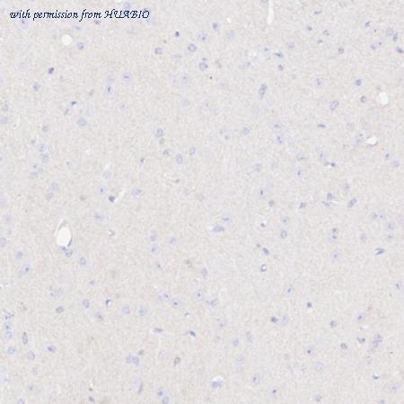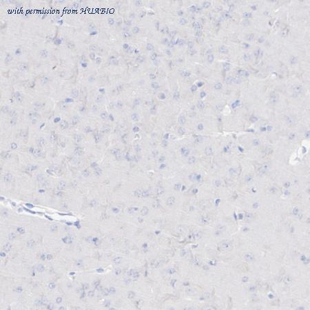 Immunohistochemical analysis of paraffin-embedded normal mouse brain tissue (negative control) with Rabbit anti-beta Amyloid 1-40 antibody (HA751034) at 1/1,000 dilution. The section was pre-treated using heat mediated antigen retrieval with Tris-EDTA buffer (pH 9.0) for 20 minutes. The tissues were blocked in 1% BSA for 20 minutes at room temperature, washed with ddH2O and PBS, and then probed with the primary antibody (HA751034) at 1/1,000 dilution for 1 hour at room temperature. The detection was performed using an HRP conjugated compact polymer system. DAB was used as the chromogen. Tissues were counterstained with hematoxylin and mounted with DPX.