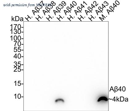Western blot analysis of beta Amyloid 1-40 on different peptides with Rabbit anti-beta Amyloid 1-40 antibody (HA750789) at 1/1,000 dilution. Lane 1: Human Aβ37 full length peptide (negative) Lane 2: Human Aβ38 full length peptide (negative) Lane 3: Human Aβ39 full length peptide (negative) Lane 4: Human Aβ40 full length peptide (positive) Lane 5: Human Aβ41 full length peptide (negative) Lane 6: Human Aβ42 full length peptide (negative) Lane 7: Human Aβ43 full length peptide (negative) Lane 8: Mouse Aβ40 full length peptide (positive) Lysates/proteins at 100 ng/Lane. Predicted band size: 4 kDa Observed band size: 4 kDa Exposure time: 10 seconds; ECL: K1801; 4-20% SDS-PAGE gel. Proteins were transferred to a PVDF membrane and blocked with 5% NFDM/TBST for 1 hour at room temperature. The primary antibody (HA750789) at 1/1,000 dilution was used in 5% NFDM/TBST at room temperature for 2 hours. Goat Anti-Rabbit IgG - HRP Secondary Antibody (HA1001) at 1/50,000 dilution was used for 1 hour at room temperature.