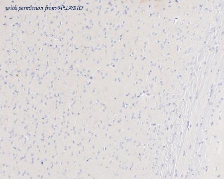 Immunohistochemical analysis of paraffin-embedded mouse brain tissue (negative control) with Rabbit anti-beta Amyloid 1-42 antibody (HA751103) at 1/1,000 dilution. The section was pre-treated using heat mediated antigen retrieval with Tris-EDTA buffer (pH 9.0) for 20 minutes. The tissues were blocked in 1% BSA for 20 minutes at room temperature, washed with ddH2O and PBS, and then probed with the primary antibody (HA751103) at 1/1,000 dilution for 1 hour at room temperature. The detection was performed using an HRP conjugated compact polymer system. DAB was used as the chromogen. Tissues were counterstained with hematoxylin and mounted with DPX.