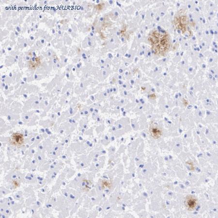 Immunohistochemical analysis of paraffin-embedded APP/PS1, 6-month mouse of AD brain tissue with Rabbit anti-beta Amyloid 1-40 antibody (HA750789) at 1/1,000 dilution. The section was pre-treated using heat mediated antigen retrieval with Tris-EDTA buffer (pH 9.0) for 20 minutes. The tissues were blocked in 1% BSA for 20 minutes at room temperature, washed with ddH2O and PBS, and then probed with the primary antibody (HA750789) at 1/1,000 dilution for 1 hour at room temperature. The detection was performed using an HRP conjugated compact polymer system. DAB was used as the chromogen. Tissues were counterstained with hematoxylin and mounted with DPX.