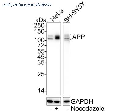 Western blot analysis of APP/beta Amyloid on different lysates with Rabbit anti-APP/beta Amyloid antibody (HA722207) at 1/1,000 dilution. Lane 1: HeLa cell lysate Lane 2: HeLa treated with 100ng/mL Nocodazole for 17 hours cell lysate Lane 3: SH-SY5Y cell lysate Lysates/proteins at 20 µg/Lane. Predicted band size: 87 kDa Observed band size: 87-120 kDa Exposure time: 1 minute 2 seconds; ECL: K1801; 4-20% SDS-PAGE gel. Proteins were transferred to a PVDF membrane and blocked with 5% NFDM/TBST for 1 hour at room temperature. The primary antibody (HA722207) at 1/1,000 dilution was used in 5% NFDM/TBST at 4℃ overnight. Goat Anti-Rabbit IgG - HRP Secondary Antibody (HA1001) at 1/50,000 dilution was used for 1 hour at room temperature.