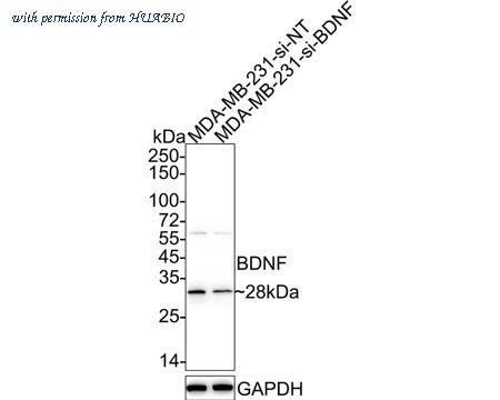 Western blot analysis of BDNF on different lysates with Rabbit anti-BDNF antibody (HA750104) at 1/20,000 dilution. Lane 1: MDA-MB-231-si NT cell lysate Lane 2: MDA-MB-231-si BDNF cell lysate Lysates/proteins at 10 µg/Lane. Predicted band size: 28 kDa Observed band size: 28 kDa Exposure time: 14 seconds; 4-20% SDS-PAGE gel. Proteins were transferred to a PVDF membrane and blocked with 5% NFDM/TBST for 1 hour at room temperature. The primary antibody (HA750104) at 1/20,000 dilution was used in 5% NFDM/TBST at 4℃ overnight. Goat Anti-Rabbit IgG - HRP Secondary Antibody (HA1001) at 1/100,000 dilution was used for 1 hour at room temperature.