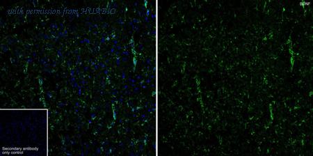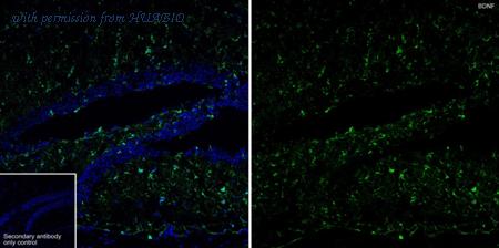 ICC staining of BNDF in SHG-44 cells (green). The nuclear counter stain is DAPI (blue). Cells were fixed in paraformaldehyde, permeabilised with 0.25% Triton X100/PBS.