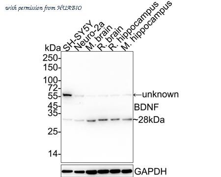 Western blot analysis of BDNF on different lysates with Rabbit anti-BDNF antibody (HA750104) at 1/5,000 dilution. Lane 1: SH-SY5Y cell lysate Lane 2: Neuro-2a cell lysate Lane 3: Mouse brain tissue lysate Lane 4: Rat brain tissue lysate Lane 5: Rat hippocampus tissue lysate Lane 6: Mouse hippocampus tissue lysate Lysates/proteins at 10 µg/Lane. Predicted band size: 28 kDa Observed band size: 28 kDa Exposure time: 1 minute 40 seconds; 4-20% SDS-PAGE gel. Proteins were transferred to a PVDF membrane and blocked with 5% NFDM/TBST for 1 hour at room temperature. The primary antibody (HA750104) at 1/5,000 dilution was used in 5% NFDM/TBST at 4℃ overnight. Goat Anti-Rabbit IgG - HRP Secondary Antibody (HA1001) at 1/50,000 dilution was used for 1 hour at room temperature.