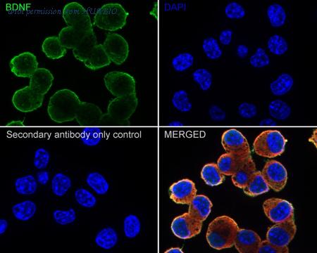 Immunocytochemistry analysis of Neuro-2a cells labeling BDNF with Rabbit anti-BDNF antibody (HA750104) at 1/100 dilution. Cells were fixed in 4% paraformaldehyde for 20 minutes at room temperature, permeabilized with 0.1% Triton X-100 in PBS for 5 minutes at room temperature, then blocked with 1% BSA in 10% negative goat serum for 1 hour at room temperature. Cells were then incubated with Rabbit anti-BDNF antibody (HA750104) at 1/100 dilution in 1% BSA in PBST overnight at 4 ℃. Goat Anti-Rabbit IgG H&L (iFluor™ 488, HA1121) was used as the secondary antibody at 1/1,000 dilution. PBS instead of the primary antibody was used as the secondary antibody only control. Nuclear DNA was labelled in blue with DAPI. Beta tubulin (M1305-2, red) was stained at 1/100 dilution overnight at +4℃. Goat Anti-Mouse IgG H&L (iFluor™ 594, HA1126) was used as the secondary antibody at 1/1,000 dilution.