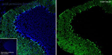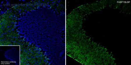 Immunohistochemical analysis of paraffin-embedded mouse cerebellum tissue with Rat anti-BLBP antibody (HA610251) at 1/200 dilution. The section was pre-treated using heat mediated antigen retrieval with Tris-EDTA buffer (pH 9.0) for 20 minutes. The tissues were blocked in 1% BSA for 20 minutes at room temperature, washed with ddH2O and PBS, and then probed with the primary antibody (HA610251) at 1/200 dilution for 1 hour at room temperature. The detection was performed using an HRP conjugated compact polymer system. DAB was used as the chromogen. Tissues were counterstained with hematoxylin and mounted with DPX.