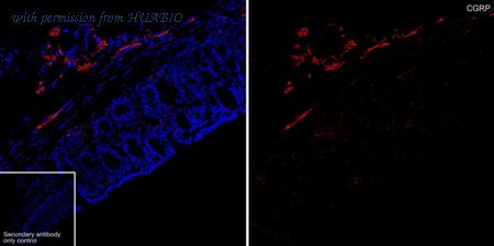 Immunofluorescence analysis of frozen mouse colon tissue with Rat anti-CGRP antibody (HA601423) at 1/500 dilution. The section was not undergone antigen retrieval. The tissues were blocked in 10% negative goat serum for 1 hour at room temperature, washed with PBS, and then probed with the primary antibody (HA601423, green) at 1/500 dilution overnight at 4 ℃, washed with PBS. Goat Anti-Rat IgG H&L (iFluor™ 488, HA1133) was used as the secondary antibody at 1/1,000 dilution. Nuclei were counterstained with DAPI (blue).