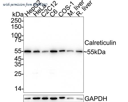 Western blot analysis of Calreticulin on different lysates with Mouse anti-Calreticulin antibody (HA610363) at 1/10,000 dilution. Lane 1: HepG2 cell lysate Lane 2: HeLa cell lysate Lane 3: C2C12 cell lysate Lane 4: C6 cell lysate Lane 5: COS-1 cell lysate Lane 6: Mouse liver tissue lysate Lane 7: Rat liver tissue lysate Lysates/proteins at 15 µg/Lane. Predicted band size: 48 kDa Observed band size: 55 kDa Exposure time: 10 seconds; ECL: K1801; 4-20% SDS-PAGE gel. Proteins were transferred to a PVDF membrane and blocked with 5% NFDM/TBST for 1 hour at room temperature. The primary antibody (HA610363) at 1/10,000 dilution was used in primary antibody dilution (K1803) at 4℃ overnight. Goat Anti-Mouse IgG - HRP Secondary Antibody (HA1006) at 1/50,000 dilution was used for 1 hour at room temperature.