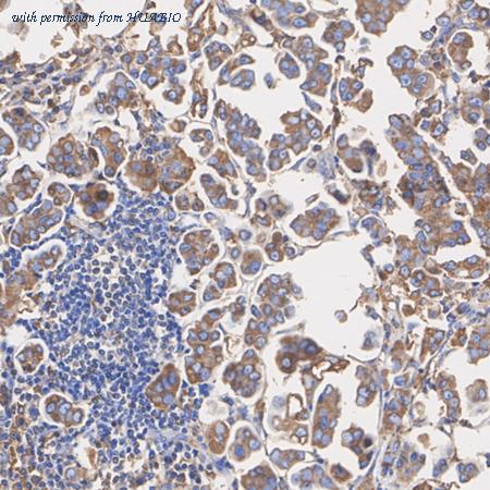 Immunohistochemical analysis of paraffin-embedded human breast carcinoma tissue with Mouse anti-Calreticulin antibody (HA601547) at 1/20,000 dilution. The section was pre-treated using heat mediated antigen retrieval with Tris-EDTA buffer (pH 9.0) for 20 minutes. The tissues were blocked in 1% BSA for 20 minutes at room temperature, washed with ddH2O and PBS, and then probed with the primary antibody (HA601547) at 1/20,000 dilution for 1 hour at room temperature. The detection was performed using an HRP conjugated compact polymer system. DAB was used as the chromogen. Tissues were counterstained with hematoxylin and mounted with DPX.
