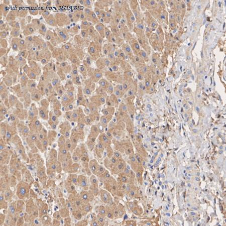 Immunohistochemical analysis of paraffin-embedded human liver tissue with Mouse anti-Calreticulin antibody (HA601547) at 1/20,000 dilution. The section was pre-treated using heat mediated antigen retrieval with Tris-EDTA buffer (pH 9.0) for 20 minutes. The tissues were blocked in 1% BSA for 20 minutes at room temperature, washed with ddH2O and PBS, and then probed with the primary antibody (HA601547) at 1/20,000 dilution for 1 hour at room temperature. The detection was performed using an HRP conjugated compact polymer system. DAB was used as the chromogen. Tissues were counterstained with hematoxylin and mounted with DPX.