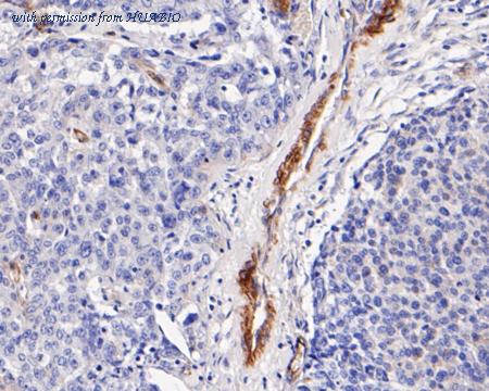 Immunohistochemical analysis of paraffin-embedded human kidney tissue with Rabbit anti-Caveolin-1 antibody (0407-6) at 1/100 dilution. The section was pre-treated using heat mediated antigen retrieval with Tris-EDTA buffer (pH 9.0) for 20 minutes. The tissues were blocked in 1% BSA for 20 minutes at room temperature, washed with ddH2O and PBS, and then probed with the primary antibody (0407-6) at 1/100 dilution for 1 hour at room temperature. The detection was performed using an HRP conjugated compact polymer system. DAB was used as the chromogen. Tissues were counterstained with hematoxylin and mounted with DPX.