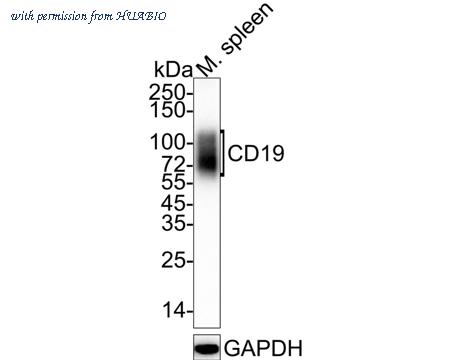 Western blot analysis of CD19 on mouse spleen tissue lysates with Rabbit anti-CD19 antibody (HA750919) at 1/1,000 dilution. Lysates/proteins at 20 µg/Lane. Predicted band size: 60 kDa Observed band size: 60-120 kDa Exposure time: 30 seconds; 4-20% SDS-PAGE gel. Proteins were transferred to a PVDF membrane and blocked with 5% NFDM/TBST for 1 hour at room temperature. The primary antibody (HA750919) at 1/1,000 dilution was used in 5% NFDM/TBST at 4℃ overnight. Goat Anti-Rabbit IgG - HRP Secondary Antibody (HA1001) at 1/50,000 dilution was used for 1 hour at room temperature.