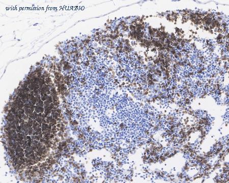 Immunohistochemical analysis of paraffin-embedded mouse lymph node tissue with Rabbit anti-CD19 antibody (HA722073) at 1/500 dilution. The section was pre-treated using heat mediated antigen retrieval with Tris-EDTA buffer (pH 9.0) for 20 minutes. The tissues were blocked in 1% BSA for 20 minutes at room temperature, washed with ddH2O and PBS, and then probed with the primary antibody (HA722073) at 1/500 dilution for 1 hour at room temperature. The detection was performed using an HRP conjugated compact polymer system. DAB was used as the chromogen. Tissues were counterstained with hematoxylin and mounted with DPX.
