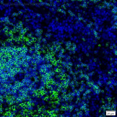 mIHC analysis of mouse spleen tissue (Formalin/PFA-fixed paraffin-embedded sections) with Rabbit anti-CD19 antibody (IRS110RB) at 1/100 dilution. The immunostaining was performed with the IRISKitCmTSA Kit (900808). Heat mediated antigen retrieval with Tris-EDTA buffer (pH 9.0) for 30 mins at 95℃. DAPI (blue) was used as a nuclear counter stain. Image acquisition was performed with Olympus VS200 Slide Scanner.