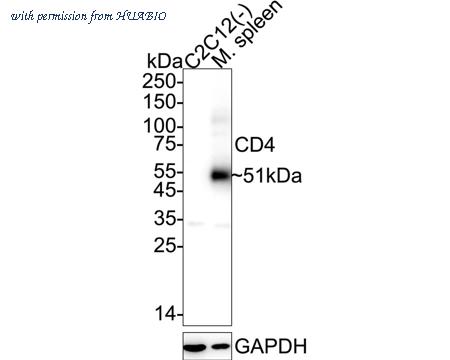 Western blot analysis of CD4 on different lysates with Rabbit anti-CD4 antibody (HA751213) at 1/2,000 dilution. Lane 1: C2C12 cell lysate (negative) (20 µg/Lane) Lane 2: Mouse spleen tissue lysate (40 µg/Lane) Predicted band size: 51 kDa Observed band size: 51 kDa Exposure time: 30 seconds; ECL: K18012; 4-20% SDS-PAGE gel. Proteins were transferred to a PVDF membrane and blocked with 5% NFDM/TBST for 1 hour at room temperature. The primary antibody (HA751213) at 1/2,000 dilution was used in 5% NFDM/TBST at 4℃ overnight. Goat Anti-Rabbit IgG - HRP Secondary Antibody (HA1001) at 1/50,000 dilution was used for 1 hour at room temperature.