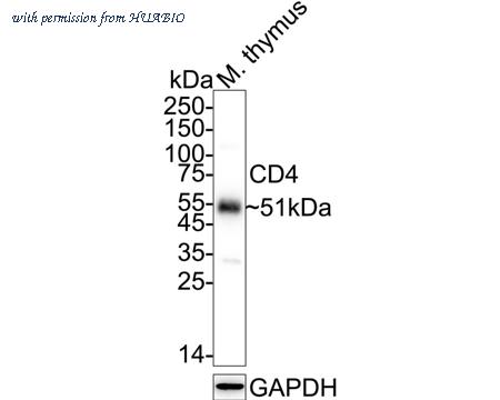 Western blot analysis of CD4 on Mouse thymus tissue lysates with Rabbit anti-CD4 antibody (HA751213) at 1/2,000 dilution. Lysates/proteins at 40 µg/Lane. Predicted band size: 51 kDa Observed band size: 51 kDa Exposure time: 30 seconds; ECL: K1801; 4-20% SDS-PAGE gel. Proteins were transferred to a PVDF membrane and blocked with 5% NFDM/TBST for 1 hour at room temperature. The primary antibody (HA751213) at 1/2,000 dilution was used in 5% NFDM/TBST at 4℃ overnight. Goat Anti-Rabbit IgG - HRP Secondary Antibody (HA1001) at 1/50,000 dilution was used for 1 hour at room temperature.