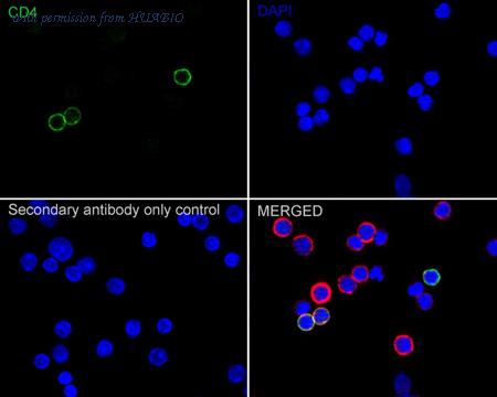 Immunocytochemistry analysis of HUT 102 cells labeling CD4 with Rabbit anti-CD4 antibody (HA723511) at 1/500 dilution. Cells were fixed in 4% paraformaldehyde for 15 minutes at room temperature, permeabilized with 0.1% Triton X-100 in PBS for 15 minutes at room temperature, then blocked with 1% BSA in 10% negative goat serum for 1 hour at room temperature. Cells were then incubated with Rabbit anti-CD4 antibody (HA723511) at 1/500 dilution in 1% BSA in PBST overnight at 4 ℃. Goat Anti-Rabbit IgG H&L (iFluor™ 488, HA1121) was used as the secondary antibody at 1/1,000 dilution. PBS instead of the primary antibody was used as the secondary antibody only control. Nuclear DNA was labelled in blue with DAPI. Beta tubulin (HA601187, red) was stained at 1/100 dilution overnight at +4℃. Goat Anti-Mouse IgG H&L (iFluor™ 594, HA1126) was used as the secondary antibody at 1/1,000 dilution.