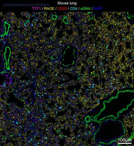 mIHC analysis of mouse lung tissue (Formalin/PFA-fixed paraffin-embedded sections) with TTF1 (IRS063), RAGE (IRS073), CD20, CD4 (IRS051) and aSMA (IRS048) antibody at 1/100 dilution. The immunostaining was performed with the IRISKitCmTSA Kit (900802). Heat mediated antigen retrieval with Tris-EDTA buffer (pH 9.0) for 30 mins at 95℃. DAPI (blue) was used as a nuclear counter stain. Image acquisition was performed with Olympus VS200 Slide Scanner.