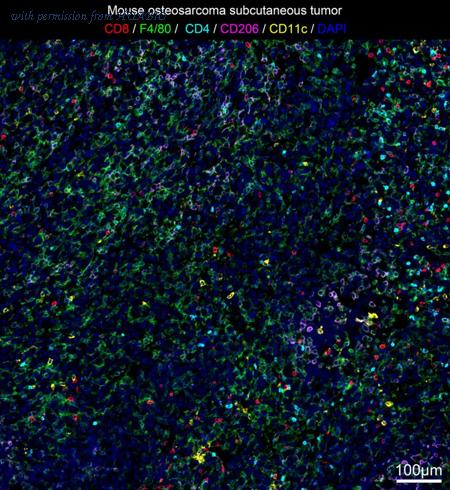 mIHC analysis of mouse osteosarcoma subcutaneous tumor tissue (Formalin/PFA-fixed paraffin-embedded sections) with CD8, F4/80 (IRS052), CD4 (IRS051), CD206 (IRS049) and CD11c antibody at 1/100 dilution. The immunostaining was performed with the IRISKitCmTSA Kit (900802). Heat mediated antigen retrieval with Tris-EDTA buffer (pH 9.0) for 30 mins at 95℃. DAPI (blue) was used as a nuclear counter stain. Image acquisition was performed with Olympus VS200 Slide Scanner.
