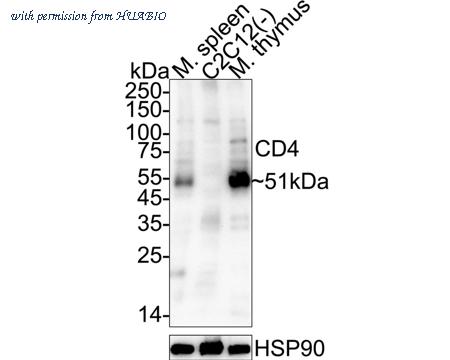 Western blot analysis of CD4 on different lysates with Mouse anti-CD4 antibody (HA610353) at 1/2,000 dilution. Lane 1: Mouse spleen tissue lysate Lane 2: C2C12 cell lysate (negative) Lane 3: Mouse thymus tissue lysate Lysates/proteins at 20 µg/Lane. Predicted band size: 51 kDa Observed band size: 51 kDa Exposure time: 1 minute 34 seconds; ECL: K1801; 4-20% SDS-PAGE gel. Proteins were transferred to a PVDF membrane and blocked with 5% NFDM/TBST for 1 hour at room temperature. The primary antibody (HA610353) at 1/2,000 dilution was used in primary antibody dilution (K1803) at 4℃ overnight. Goat Anti-Mouse IgG - HRP Secondary Antibody (HA1006) at 1/50,000 dilution was used for 1 hour at room temperature.