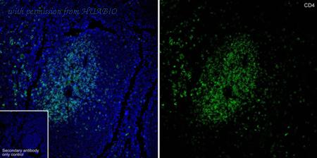 Immunocytochemistry analysis of mouse splenocytes labeling CD4 with Rabbit anti-CD4 antibody (HA751213) at 1/250 dilution. Cells were fixed in 4% paraformaldehyde for 15 minutes at room temperature, permeabilized with 0.1% Triton X-100 in PBS for 15 minutes at room temperature, then blocked with 1% BSA in 10% negative goat serum for 1 hour at room temperature. Cells were then incubated with Rabbit anti-CD4 antibody (HA751213) at 1/250 dilution in 1% BSA in PBST overnight at 4 ℃. Goat Anti-Rabbit IgG H&L (iFluor™ 488, HA1121) was used as the secondary antibody at 1/1,000 dilution. PBS instead of the primary antibody was used as the secondary antibody only control. Nuclear DNA was labelled in blue with DAPI. Beta tubulin (HA601187, red) was stained at 1/100 dilution overnight at +4℃. Goat Anti-Mouse IgG H&L (iFluor™ 594, HA1126) was used as the secondary antibody at 1/1,000 dilution.