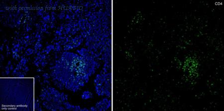 Immunohistochemical analysis of paraffin-embedded human spleen tissue with Rabbit anti-CD4 antibody (HA723511) at 1/5,000 dilution. The section was pre-treated using heat mediated antigen retrieval with Tris-EDTA buffer (pH 9.0) for 20 minutes. The tissues were blocked in 1% BSA for 20 minutes at room temperature, washed with ddH2O and PBS, and then probed with the primary antibody (HA723511) at 1/5,000 dilution for 1 hour at room temperature. The detection was performed using an HRP conjugated compact polymer system. DAB was used as the chromogen. Tissues were counterstained with hematoxylin and mounted with DPX.