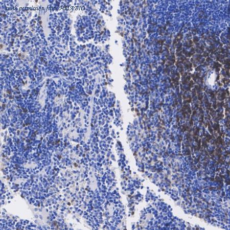 Immunohistochemical analysis of paraffin-embedded mouse spleen tissue with Rat anti-CD4 antibody (HA610354) at 1/2,000 dilution. The section was pre-treated using heat mediated antigen retrieval with Tris-EDTA buffer (pH 9.0) for 20 minutes. The tissues were blocked in 1% BSA for 20 minutes at room temperature, washed with ddH2O and PBS, and then probed with the primary antibody (HA610354) at 1/2,000 dilution for 1 hour at room temperature. The detection was performed using an HRP conjugated compact polymer system. DAB was used as the chromogen. Tissues were counterstained with hematoxylin and mounted with DPX.